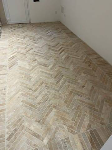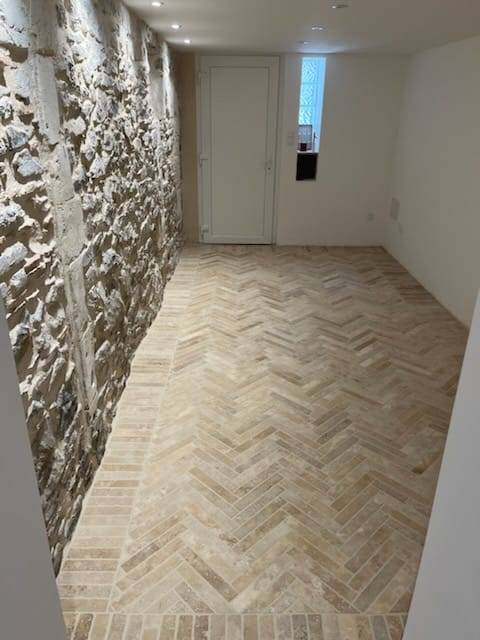 La pose en CHEVRON EN TRAVERTIN est particulièrement appréciée pour adopter un style chic et contemporain