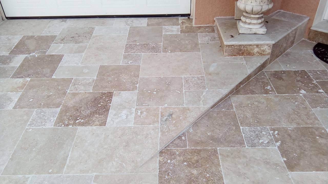 • TRAVERTIN SCABOS 1er choix : sélection de beige/ocre/marron, pas de trou traversant, rares aspérités de surface