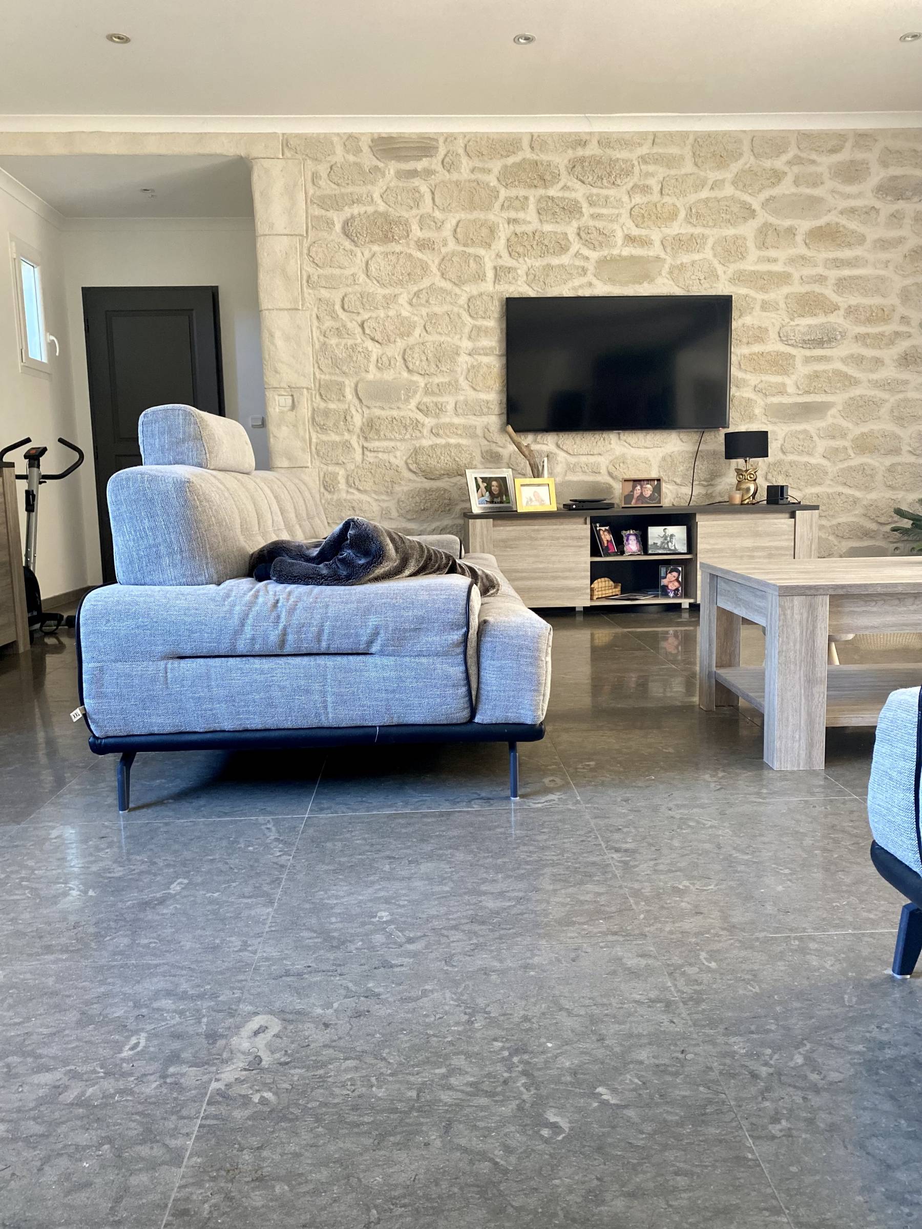 Le DALLAGE INTERIEUR EN PIERRE NATURELLE CASTELLA GRISE / CENIA AZUL / PIERRE GRISE est généralement vendue avec sa finition adoucie ou brossée pour une surface plus agréable aux pieds.